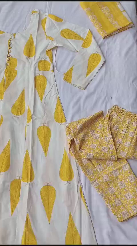 Cotton New Designer Kurta Pant And Dupatta Set Yellow