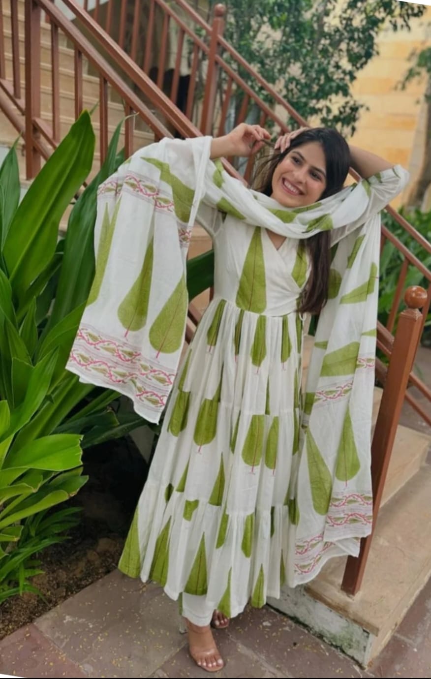 Pure Cotton New Stylish Anarkali Kurta Pant With Dupatta Set Tilak Green